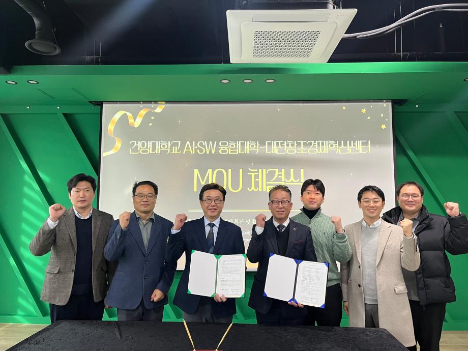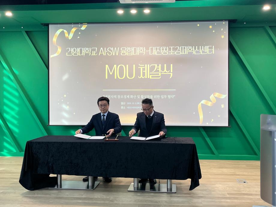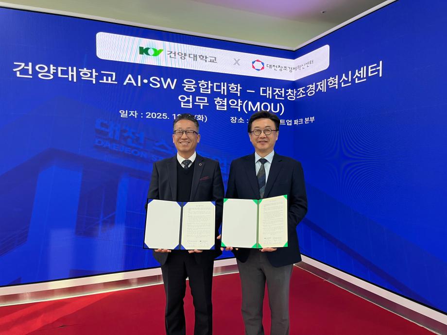 건양대학교, 대전창조경제혁신센터와 지역 창업 활성화 위한 업무협약 체결 – AI·SW 기반 창업 활성화 모델 구축… 창업인재 양성·기술사업화·딥테크 분야 협력 강화 – 건양대학교(총장 김용하) AI·SW융합대학(학장 김용석)은 12월 2일, (재)대전창조경제혁신센터(대표이사 박대희)와 AI 기반 창업 활성화 모델 구축과 지역 창업 생태계 고도화로 지역 창조경제 확산 및 창업 활성화를 위한 **업무협약(MOU)**을 체결했다고 밝혔다. 이번 협약은 대전·충남 지역 창업 생태계의 혁신적 성장을 목표로 양 기관이 보유한 교육·연구·창업지원 역량을 결합해 실질적인 성과 창출을 도모하기 위해 마련됐다. 양 기관은 ▲창업인재 양성과 기술사업화 활성화 ▲산학 연계 창업기업 발굴 및 성장 지원 ▲교육·멘토링·네트워크 행사 공동 추진 ▲2026년 초기창업패키지 딥테크 분야 협력 ▲창업 관련 연구 및 공모사업 공동 대응 등 다양한 분야에서 긴밀히 협력할 계획이다. 특히 건양대학교는 AI·SW 중심 교육혁신과 AX 기반 실습·실증 체계를 보유하고 있어, 학생·지역 예비창업자들이 AI·SW기술을 활용해 문제 해결형 창업 아이템을 개발하고, 시제품 제작·검증·시장 진출까지 이어지는 AI 기반 창업 전체주기 모델을 구축한다는 계획이다. 대전창조경제혁신센터는 창업지원 인프라, 전문 멘토단, 투자·실증 네트워크를 기반으로 대학이 발굴한 기술·인재와 연결해 실질적인 성과 창출을 돕기로 협의하였다. 김용석 학장은 “AI는 산업의 패러다임을 바꾸는 핵심 기술이며, 대학은 이러한 시대 변화에 대응할 창업 인재 양성의 중심 역할을 수행해야 한다”며, “이번 협약을 통해 대학의 AI 교육 역량과 센터의 창업지원 역량이 결합한 AI 기반 창업 활성화 모델을 본격 구축하겠다”고 밝혔다.